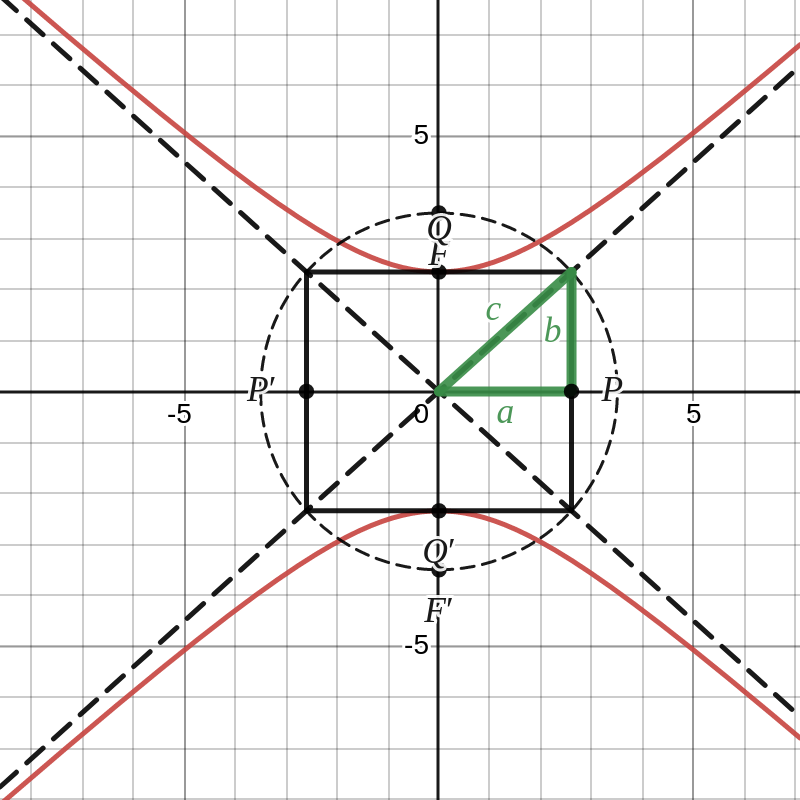 De brandpunten zijn nu \(F\left (0,c \right )\) en \(F'\left (0,-c \right )\) met \(c=\sqrt{a^2+b^2}\text{.}\) Voor een willekeurig punt \(D\) van de hyperbool geldt nu dat \(||DF|-|DF'||=2b\text{.}\)