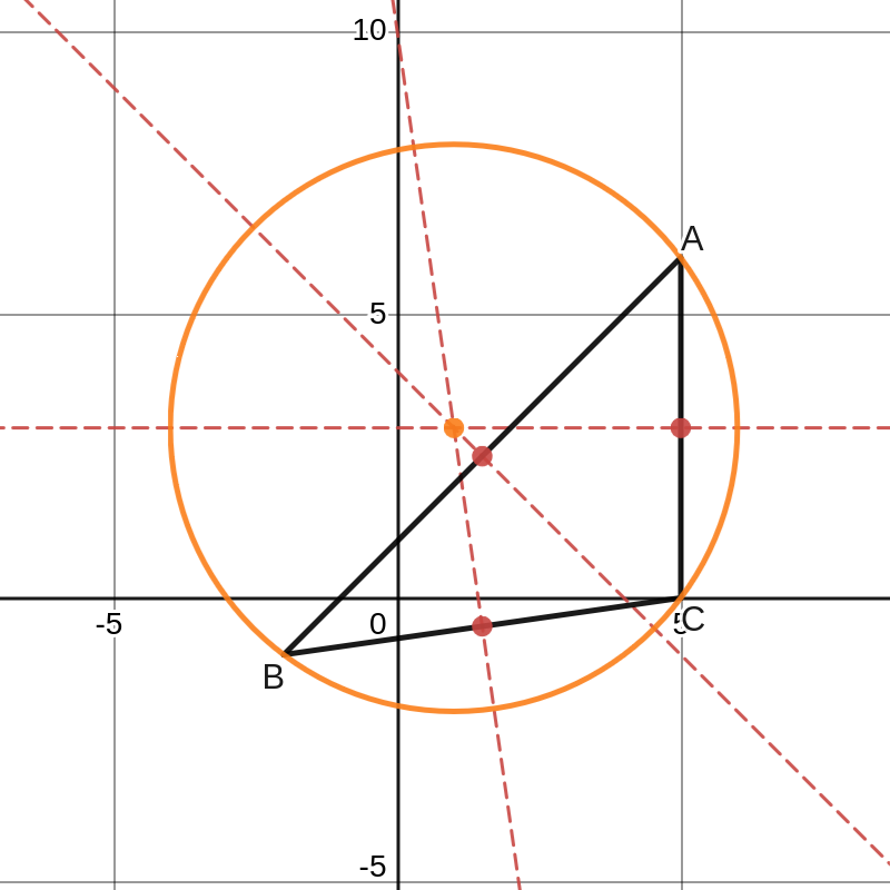 Stel de vergelijking op van de omgeschreven cirkel van de driehoek \(ABC\text{.}\)